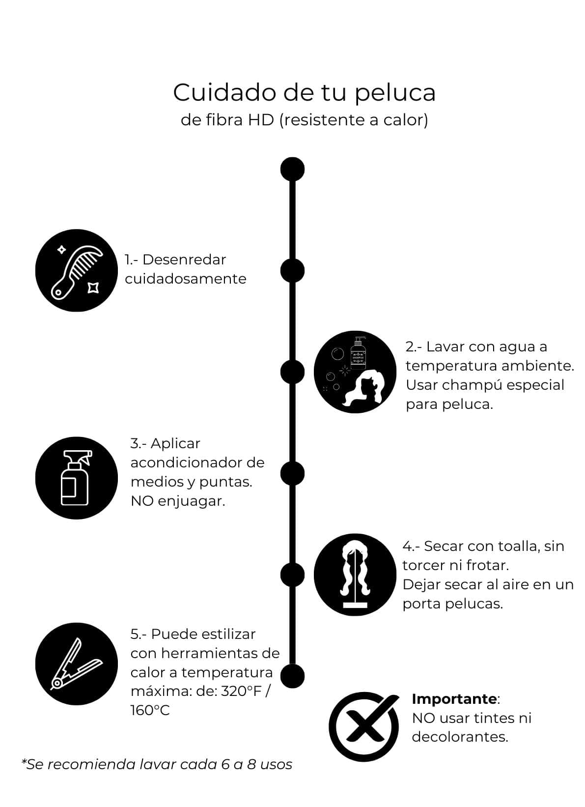 Peluca de fibra sintética HD resistente al calor. La fibra sedosa y resistente al calor se puede peinar con calor para lograr cualquier estilo que elijas, puede utilizar herramientas de calor a no más de 320°F o su equivalente a 160°C. Este modelo cuenta con lace front, una parte superior de monofilamento que permite hacer la línea del cabello en varias direcciones y cuenta con capas largas.