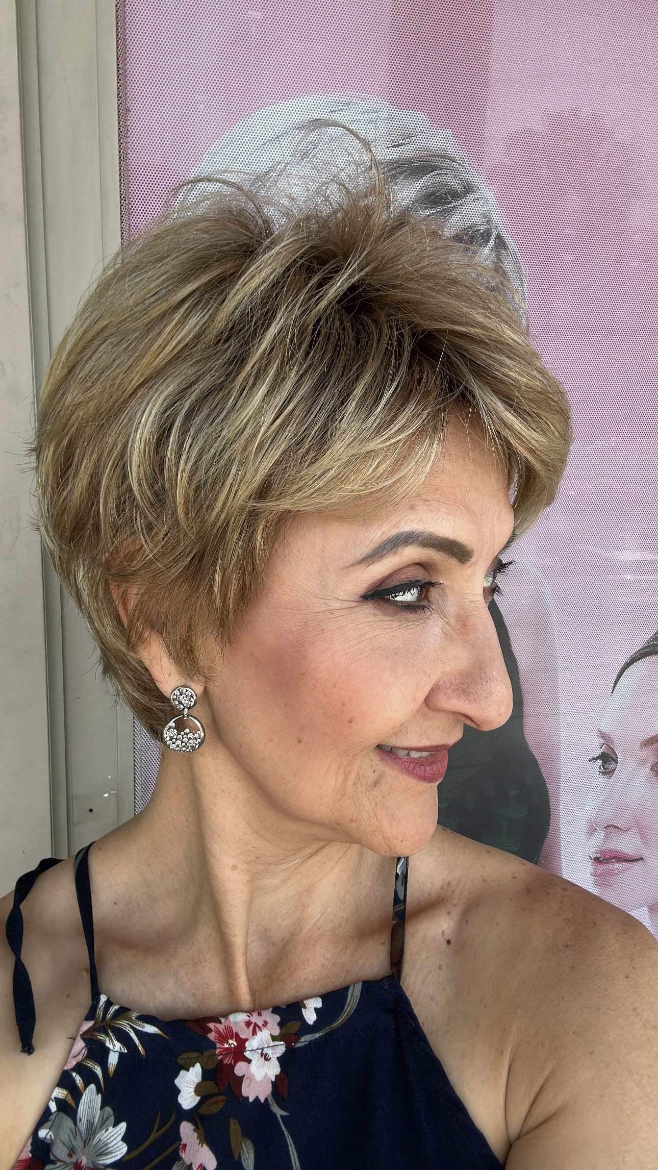 Peluca de fibra sintética. Esta elegante peluca presenta un diseño de gorra elaborada a máquina para proporcionar un volumen instantáneo. Este estilo clásico proporciona una silueta elegante. No utilice herramientas de calor en ella ni use tintes en ella.