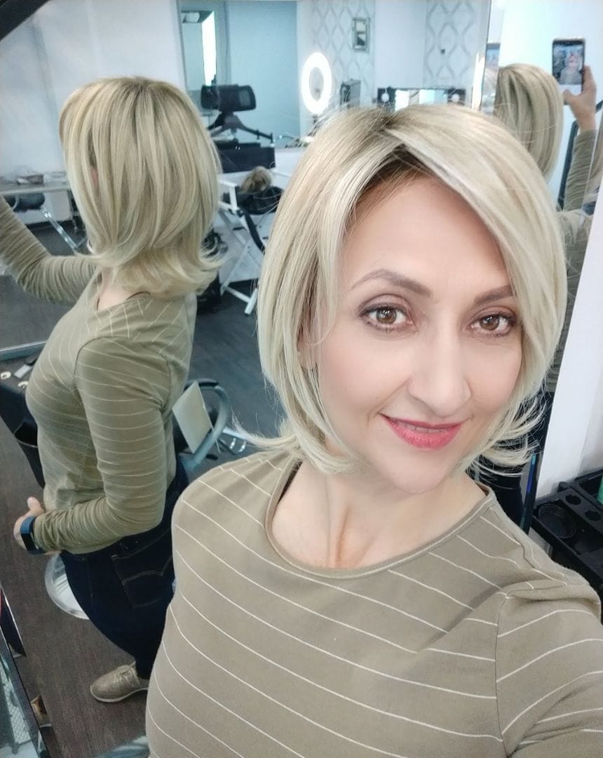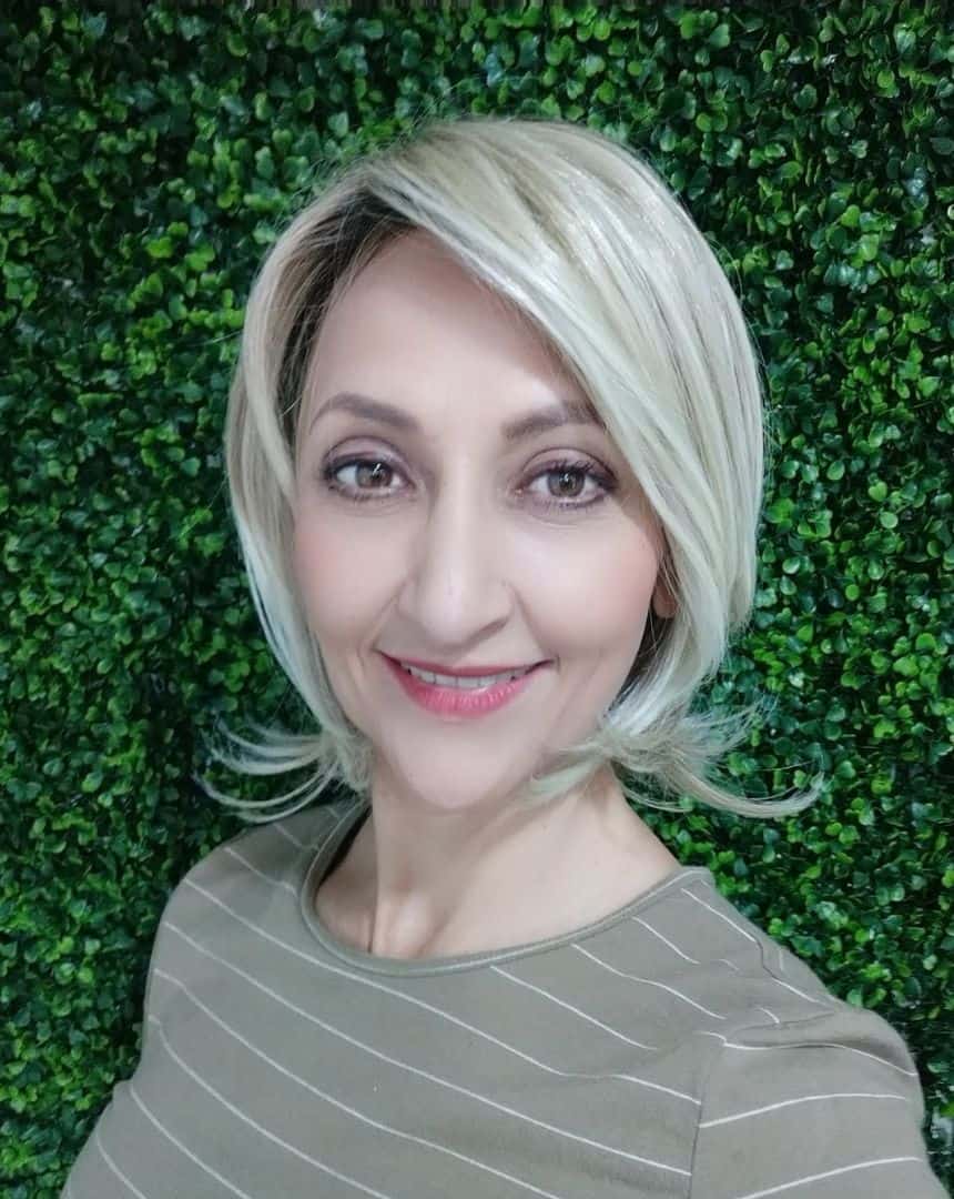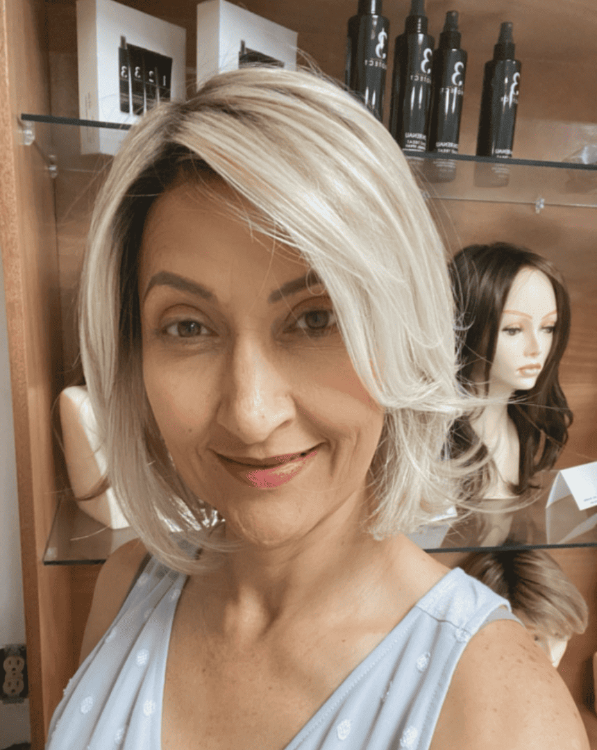 Peluca de fibra sintética HD resistente al calor. La fibra sedosa y resistente al calor se puede peinar con calor para lograr cualquier estilo que elijas, puede utilizar herramientas de calor a no más de 320°F o su equivalente a 160°C. Este modelo cuenta con lace front, una parte superior de monofilamento que permite hacer el apartado en cualquier dirección. Cada fibra está anudada a mano de manera individual lo que le da un movimiento muy natural. Elizabeth es sinónimo de elegancia y distinción.
