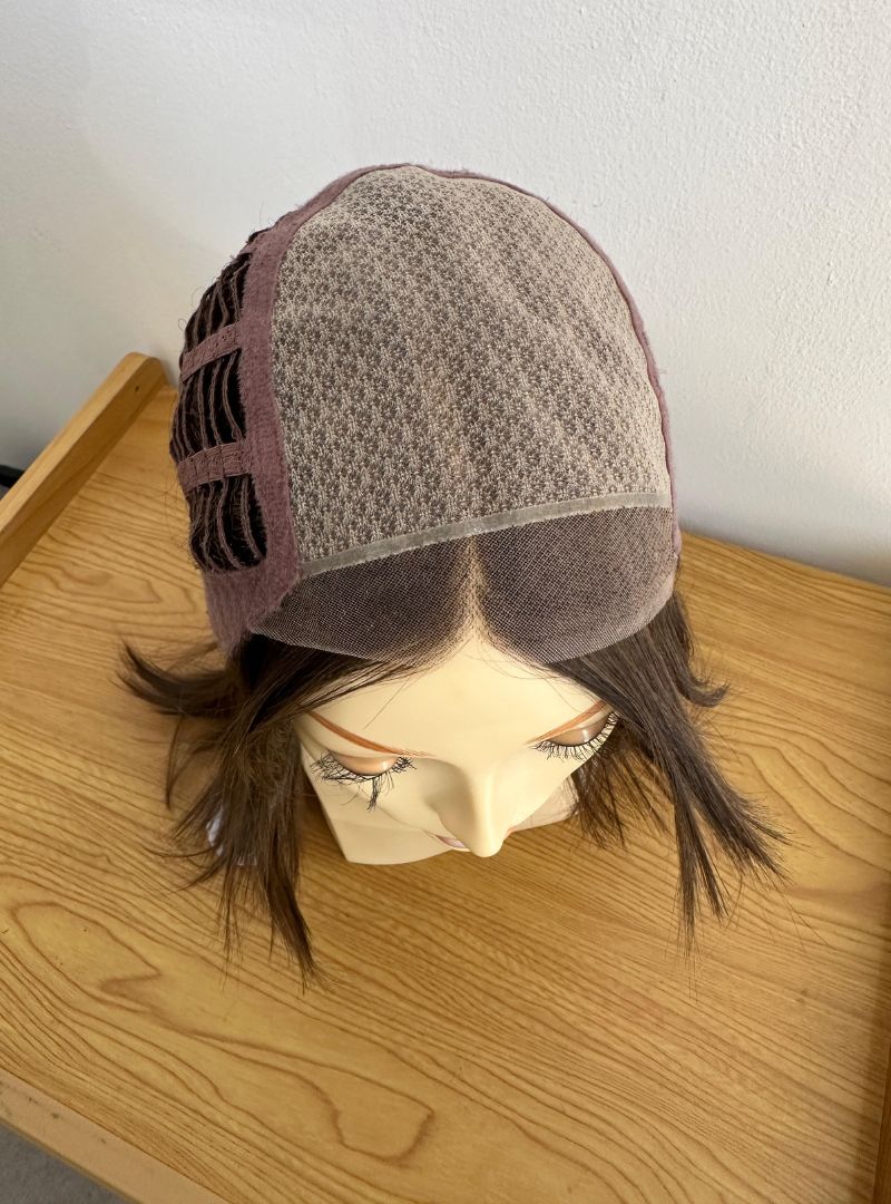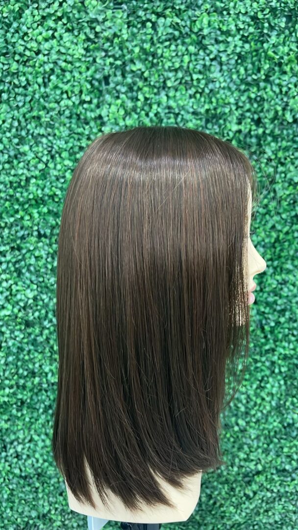 Peluca de fibra sintética. Este modelo cuenta con lace front, una parte superior de monofilamento que permite hacer una raya en varias direcciones y cuenta con un corte medio en estilo lacio.