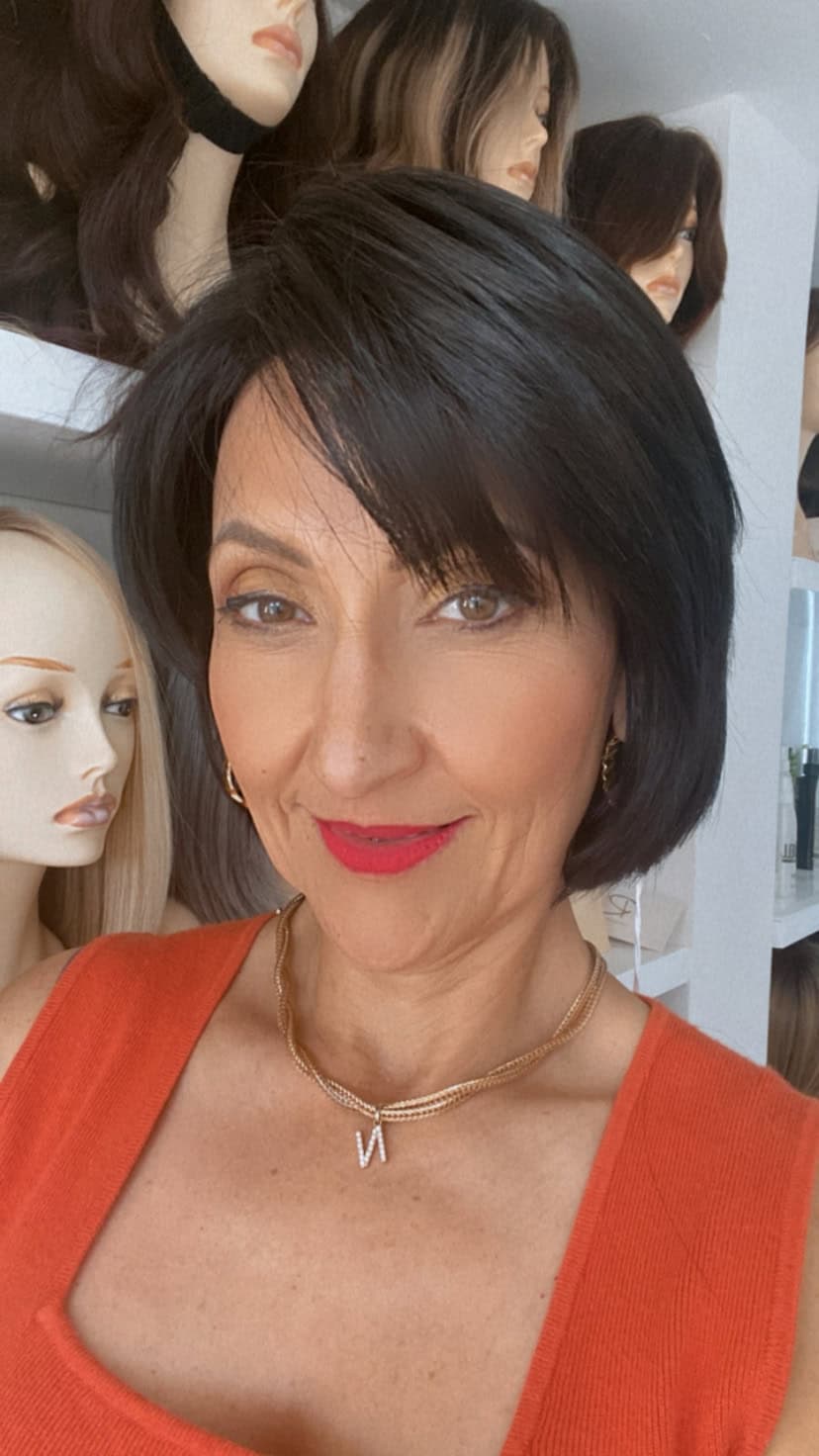 Peluca de fibra sintética. Peluca hecha a máquina con lengüetas ajustables en el área de la nuca para permitir un ajuste más cómodo. Tiene un estilo bob con capas y volumen y un flequillo ligero. No utilice herramientas de calor en ella ni use tintes en ella.